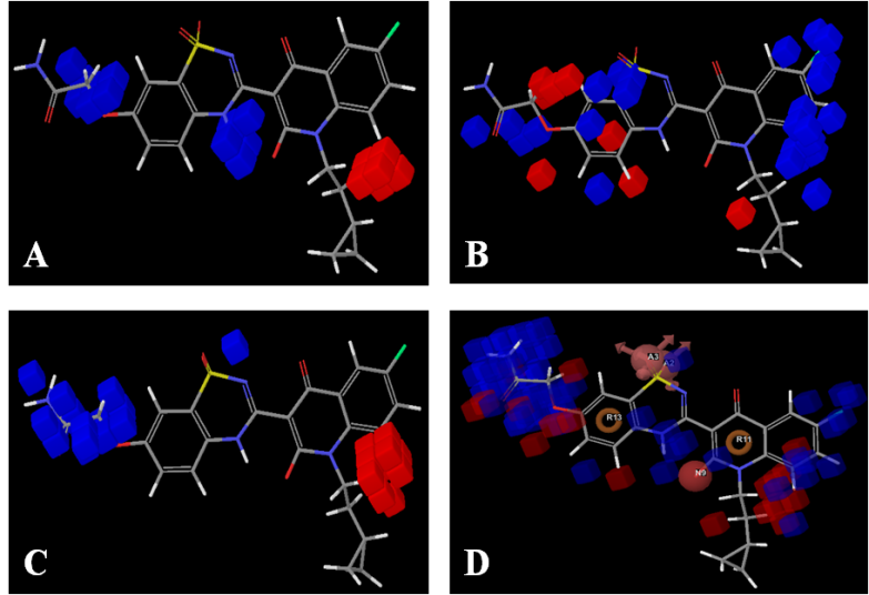 In the present study, a pharmacophore modelling and 3D-QSAR analysis was carried out using currently available NS5B inhibitors binding to Palm I site of the enzyme which could facilitate the activity prediction of newly identified Palm I inhibitors, to indentify novel NS5B inhibitors through virtual screening and help in optimizing identified hits. QSAR technique is widely used in ligand-based drug designing especially for lead optimization and identification of variable and potent compounds through virtual screening. QSAR quantifies the relationship between structural features of the compounds and biological activities. Herein an atom based QSAR model was built based on pharmacophore features generated using a group of benzothiadiazine derivatives binding to Palm I site of NS5B and tested under same experimental conditions. PHASE module of Schrodinger, New York was used for this analysis [12].