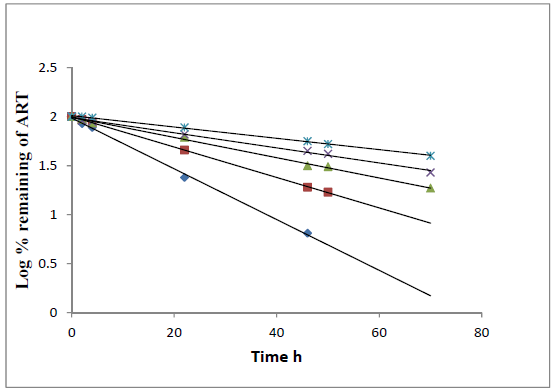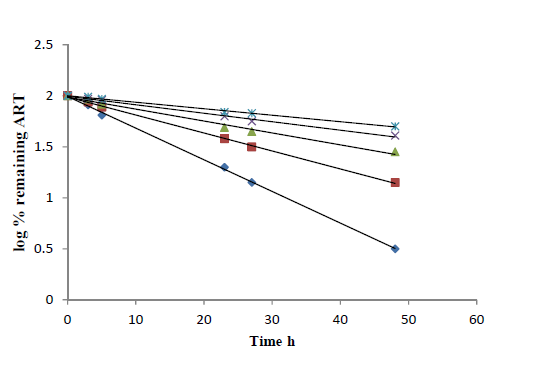 This indicated that the stability of ART was increased with the increase HP-ß-CD concentration. There was no evidence of buffer catalysis of ART and the pH values remained constant (± 0.1) throughout the course of the kinetic studies at all temperatures and in the presence and absence of HP-β-CD.