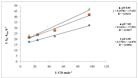 Where k0 and kc represent the rate constants for degradation of free and complexed ART respectively. The observed reaction rate for the degradation of ART in the presence of HP-β-CD is representative of the degradation rates of free and complexed ART as defined by Kst. A plot of 1/(k0 − kobs ) versus 1/[CD] will gave a linear relationship assuming a1:1 complex is formed with a y-intercept of 1/(kc − k0 ) and a slope of 1/Kst (kc − k0 ) from which the values of kc and Kst can be derived as shown in Figure (3). The values of kc and Kst were obtained from Lineweaver Burke equation (2).