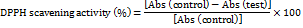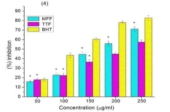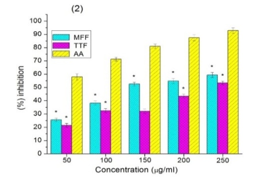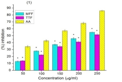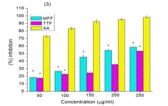 Free radical scavenging activity of TTF and MFF extracts against 2, 2-diphenyl-1-picrylhydrazyl radical (DPPH) was investigated spectrophotometrically by modified method of Chan et al. [13]. Different aliquots of both standard and sample solutions (50-250 µg/ml) were mixed with 1 ml of DPPH (0.2 mmol) solution. The mixtures were incubated in dark for 30 min at room temperature and the absorbance was measured at 517 nm. The absorbance of the control sample containing the same amount of solvent and DPPH solution was measured. Ascorbic acid was used as standard and the percent inhibition of activity was calculated using formula,
