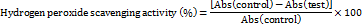 Hydrogen peroxide radical scavenging ability of TTF and MFF extracts were assessed by adopting the method given by Ruch et al. [15]. A solution of hydrogen peroxide (2 mmol) was prepared in phosphate buffer (0.2 M, pH 7.4). Extracts in different concentrations (50-250 μg/ml) were added to a hydrogen peroxide solution (0.6 ml, 2 mmol). The absorbance of hydrogen peroxide at 230 nm was determined 10 min later against a blank solution containing the phosphate buffer without hydrogen peroxide. The percentage of hydrogen peroxide scavenging of both extracts and standard compounds were calculated using formula.