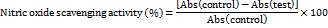 Nitric oxide radical scavenging ability of extracts was measured by adopting the modified method described by Sreejayan Rao [16]. In the assay, sodium nitroprusside generates nitric oxide (NO), which interacts with oxygen to produce nitrite ions. To 1 ml of sodium nitroprusside (SNP) solution (10 mmol), 1 ml of extract at different concentrations (50‐250 μg/ml) was added and incubated at room temperature for 2 h at 27 °C. An aliquot (1 ml) of the incubated solution was taken and diluted with 0.5 ml of griess reagent (1% sulphanilamide in 5% H3PO4 and 0.1% naphthyl ethylenediamine dihydrochloride) and the absorbance of pink coloured chromophore formed was read immediately at 550 nm and compared with standard, butylated hydroxyl toluene (BHT). Percent inhibition activity was calculated using formula.