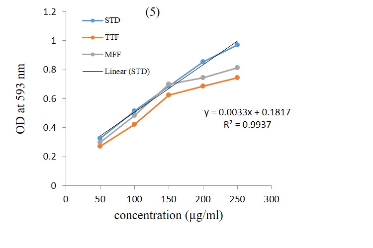 Ferric reducing/antioxidant power assay of TTF and MFF extracts were determined according to the method described by Benzie and Strain [17]. FRAP working solution was prepared by mixing 2.5 ml of 10 mmol ferric tripyridyltriazine (Fe3+-TPTZ) solution, 2.5 ml of 20 mmol ferric chloride (FeCl3).6H2o and 25 ml of 0.3M sodium acetate buffer (pH 3.6). To 1 ml of extract having different concentrations (50-250 µg/ml) 3 ml of FRAP reagent was added and incubated at 37 °C for 30 min in water bath. The increase in absorbance of the coloured product ferrous tripyridyltriazine complex (Fe2+-TPTZ) was measured spectrophotometrically at 593 nm. Fresh ferrous sulphate (FeSO4) working solution was used to plot the calibration curve. Based on the ability to reduce ferric ions by the extracts, the antioxidant capacity was calculated using linear calibration curves and results are expressed as µmol Fe2+ gram equivalent of sample.