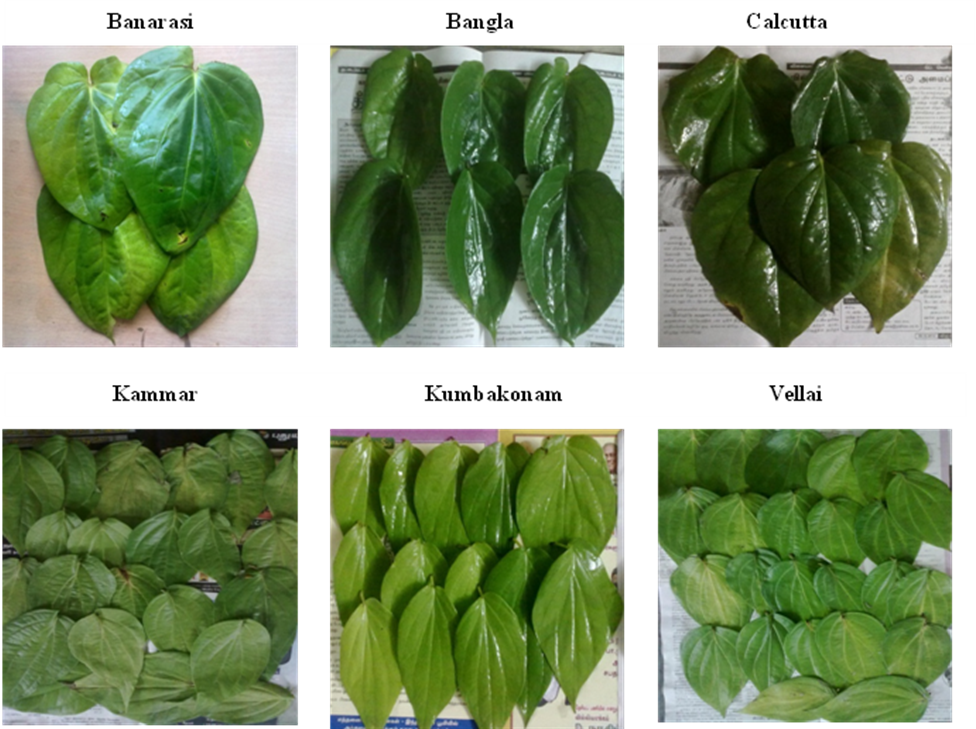 Six different cultivars of Piper betle, i. e. Banarasi, Bangla, Calcutta, Kammar, Kumbakonam and Vellai (Fig. 1) were procured from the local markets of Chennai. Healthy, uninfected and undamaged leaves were used for the study. The leaves were cleaned, washed and allowed to dry in shade. The dried leaves were pulverized using electric blender and stored for further usage.
