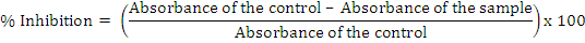 The inhibitory effect of the plant against oxidation by peroxides was evaluated by Ferric Thiocyanate assay. 120 µL of 98% ethanol, 100 µL of 2.51% linoleic acid in ethanol and 9 mL of 40 mM phosphate buffer (pH 7) were successively added to 100 µL of the plant extract. The mixed solution was maintained in dark, at 400 C.