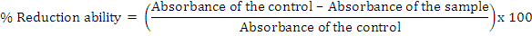 A mixture of plant extract (1 mL), phosphate buffer - 2.5 mL (of 0.2 M, pH 7) and 1% potassium ferricyanide (2.5 mL) was incubated at 500 C for 30 min. To the solution, 2.5 mL of 10% Trichloroacetic acid was added, mixed and centrifuged for 10 min at 6500 rpm. Distilled water of 2.5 mL and 0.5 mL of 0.1% FeCl3 was added to 2.5 mL of the supernatant. The absorbance of the solution was measured at 700 nm. The reducing ability of the plant was evaluated in terms of percentage by relating the absorbance value of the plant and the standard, FeSO4.