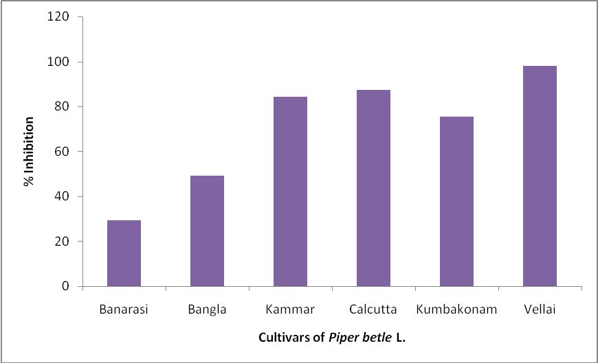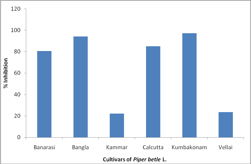 Higher flavonoid content was observed in the Kumbakonam cultivar (24.14±0.14 µg QE/g DW) while the Bangla cultivar possessed the lowest content of 8.25±0.10 µg QE/g DW. The total antioxidants of Vellai accounted to 58.82±0.39 mg TAE/g DW of the plant. The total phenolic content, flavonoid and total antioxidant activity recorded for different cultivars of Piper betle is presented in table 1.