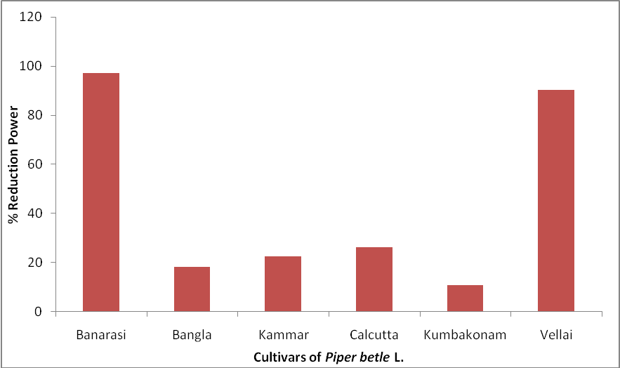 Constituents of plants play a key role in their biological activities, the concentration of which depends on the variety of the plant, season and climate [26]. The study has revealed the existence of difference in total phenolic content, flavonoid content and antioxidant activities. Among the cultivars studied, higher phenolic content was detected in the Calcutta cultivar while higher flavonoid and antioxidant content were detected in the cultivars Kumbakonam and Vellai respectively. Vellai, the cultivar with higher total antioxidant content, was found to be potent in reduction of ferrous ions to ferric ions as well. All the cultivars were potent suppressors of ABTS radical.