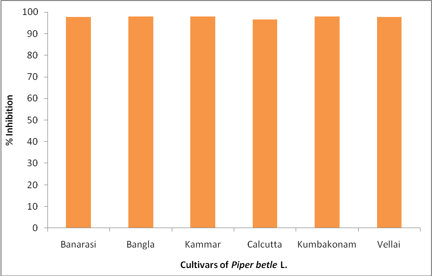 The ability of the cultivars of Piper betle L., against lipid peroxidation, evaluated using 2-Thio Barbituric Acid (TBA), revealed the efficiency of Kumbakonam cultivar in inhibiting the radicals at a percentage of 97.11 (Fig. 2). However, Kammar and Vellai cultivars showed poor inhibition capability. The cultivar Vellai showed greater reduction of ferrous ions to ferric ions, with a percentage of 98.04 and 90.20 as evaluated by FTC (Fig. 3) and FRAP (Fig. 4) assays respectively. With regard to the ABTS assay, all the cultivars were found to be highly potent inhibitors of 2,2'-azino-bis(3-ethylbenzothiazoline-6-sulphonic acid) with their inhibition closer to 98% (Fig. 5).