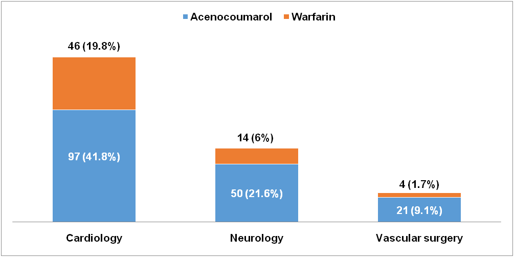 Fig. 1: Shows utilisation pattern of acenocoumarol and warfarin in each department under study