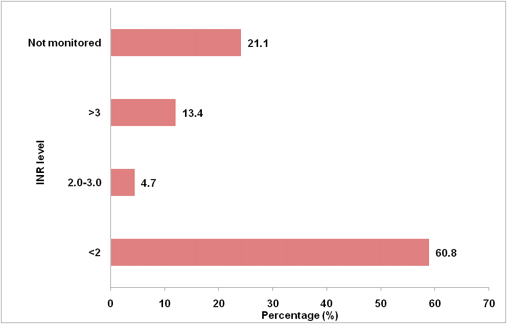 Fig. 2 shows the pattern of INR levels in the patients under study categorised according to therapeutic INR range (2-3). It also depicts the percentage of patients in whom INR monitoring was not adviced.