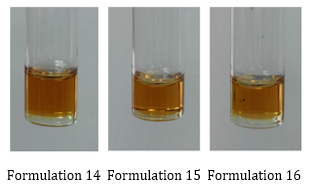 The stability of the microemulsions can be evaluated via the turbidity changes [2]. Turbidity is parallel to the mean diameter of the particles, thus giving it the most common method in measuring microemulsions stability. The turbidity of formulation 14, 15 and 16 was negative, indicating that the microemulsions remained stable following exposure to stressful conditions. The microemulsions were also monitored for one month storage at room temperature.