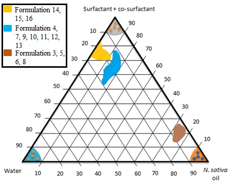 Fig. 6: Pseudoternary diagram of sorbitan-based N. sativa microemulsions