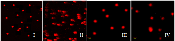 The genoprotective effect of taurine against ROS in peripheral blood leukocytes of hypercholesterolemic rats was evaluated using single cell gel electrophoresis and has been presented in fig. 1 and in table 4. Results indicate that the nuclear DNA was confined to their position in a compact form in the control group (Group I). The hypercholesterolemic group (Group II) showed significantly increased comet parameters such as tail DNA %, tail length (L), tail moment (TM) and olive tail moment (OTM) as evaluated against control. Atorvastatin treatment (Group III) showed a significant reduction in the comet tail index, tail DNA %, tail moment and olive tail moment as compared to hypercholesterolemic rats (Group II). Taurine treatment (Group IV) also showed a significant reduction in the comet tail index, tail DNA %, tail moment and olive tail moment as compared to hypercholesterolemic rats (Group II).