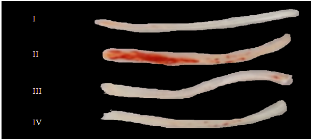 Fig. 3: Representative photographs of the intimal surfaces of aortas of the four groups, stained with sudan IV. The lipid deposits on the internal surfaces of the aortas are shown in brick red color
