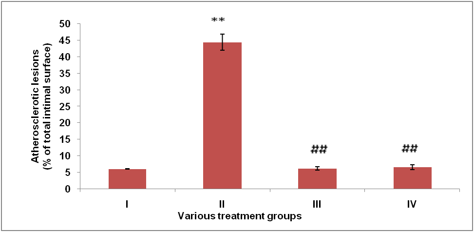 Fig. 4: Quantification of plaque deposition on intimal surfaces of aorta, Values are mean±SEM, n = 6. *P<0.05; **P<0.01 = significant as compared to Group I and #P<0.05; ##P<0.01 = significant as compared to group II