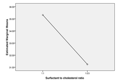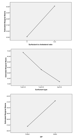 Many non-ionic surfactants form vesicles when CH is included in the bilayer to the level of 30-50 mole% [45]. CH imparts rigidity to vesicles, which is very important under severe stress conditions [46]. CH improves the fluidity of the bilayer membrane and improves the stability of the bilayer membrane in the presence of biological fluids such as blood/plasma [47]. Depending on the data obtained from our factorial design, surfactant to CH ratio had a significant effect on the entrapment efficiency (p < 0.05). Higher entrapment was found at surfactant / CH molar ratio of 1:1. The effect of CH molar ratios on entrapment efficiency is demonstrated in Table 3. High entrapment was found in Tween 20 and Tween 60 formulation at CH /surfactant molar ratio of 1:1. The interaction of CH with Span 60 in the bilayer of niosomes is due to hydrogen bonding [46].