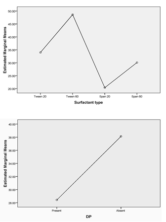 Analysis of factorial design demonstrated that the surfactant type had a significant effect on the release efficiency percentage after 6 h (p < 0.05) as shown in Fig. 8. The release efficiency of different surfactants could be ranked as follow: Tween 20 > Tween 60 > Span 60. This can be explained by the fact that niosomes exhibit an alkyl chain length-dependent release and the higher the chain length, the lower the release rate [45].