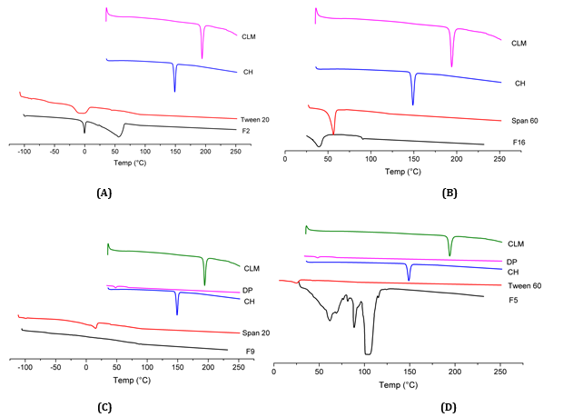 Fig. 4: Differential Scanning Calorimetry (DSC) measurements of niosome components and CLM loaded niosomal formulae (A) F2; (B) F16; (C) F9; (D) F5