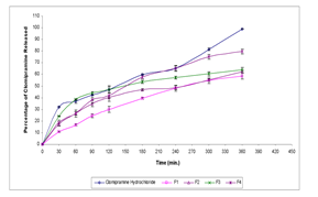 Fig. 5: Percentage release profile of CLM from niosomal formulae (F1–F4)