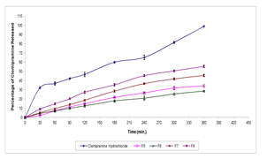 Fig. 6: Percentage release profile of CLM from niosomal formulae (F5–F8)