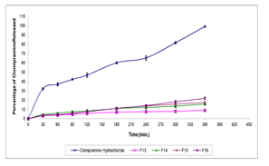 Fig. 7: Percentage release profile of CLM from niosomal formulae (F13–F16)