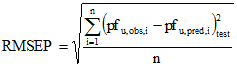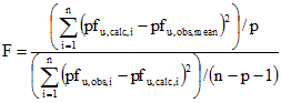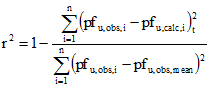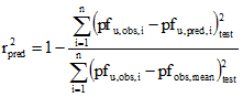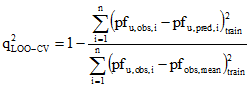 where pfu,obs,i and pfu,calc,i are the observed and calculated by the model values of pfu for the ith compound in the training set, and pfu,obs,mean is the mean observed value for pfu.