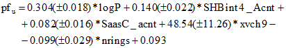 Where logP is the calculated n-octanol/water partition coefficient, Dipole–the dipole moment of the molecule, xvch9–valence 9th order chain connectivity index, SaasC_acnt, SaaaC_acnt and SaaN_acnt–the number of atoms of the type aasC, aaaC and aaN. Six drugs (aminocamptothecin, felodipine, nisoldipine, paclitaxel, paricalcitol, tacrolimus) were identified as outliers and were removed before construction of the final model. Statistic metrics of the model were as follows: r2=0.768, q2LOO-CV = 0.731, SEE = 0.323, F = 57.39, MFEP = 1.97, GMFE = 1.79, and accuracy at 2-fold level error = 67.6%.