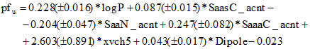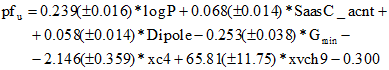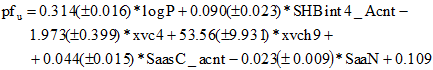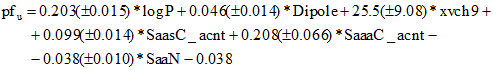 The present study was focused on QSPkR modeling of PPB of neutral drugs. The dataset consisted of 117 compounds, described by 138 molecular descriptors. The negative logarithm of the free fraction in plasma (pfu =-logfu) was used as an end-point variable. A three-step procedure was applied for selection of the most significant variables including manual filtering, GA and SWR. A number of significant QSPkRs were generated by MLR. Although built on training tests which differ in 25% of their content, the models were fairly similar in terms of descriptors involved and the outliers (table 2). This, together with the statistical metrics, suggests the significance robustness of QSPkRs. The predictive performance of the models was assessed by internal and external cross-validation. The values of q2LOO-CV, r2pred, GMFEP and accuracy are in agreement with the accepted criteria for good predictive models, namely q2LOO-CV>0.5, r2pred>0.5 [53], GMFEP<2 and accuracy>60% [54].