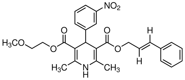Cilnidipine [CIL] is chemically, 1,4- Dihydro- 2,6- dimethyl- 4-(3-nitrophenyl)-3,5-pyridinecarboxylic acid 2-methoxyethyl(2E)-3-phenyl-propenyl ester. It is a dual blocker of L-type voltage-gated calcium channels in vascular smooth muscle and N-type calcium channels in sympathetic nerve terminals that supply blood vessels[1,2].