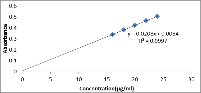 The linearity of measurement was evaluated by analyzing different concentrations of the standard solution of CIL. Beer-Lambert’s concentration range was found to be 16-24 μg/mL. The overlay spectra and calibration graph are shown in Figure 2 and 3 respectively. The optical parameters are given in Table 1.
