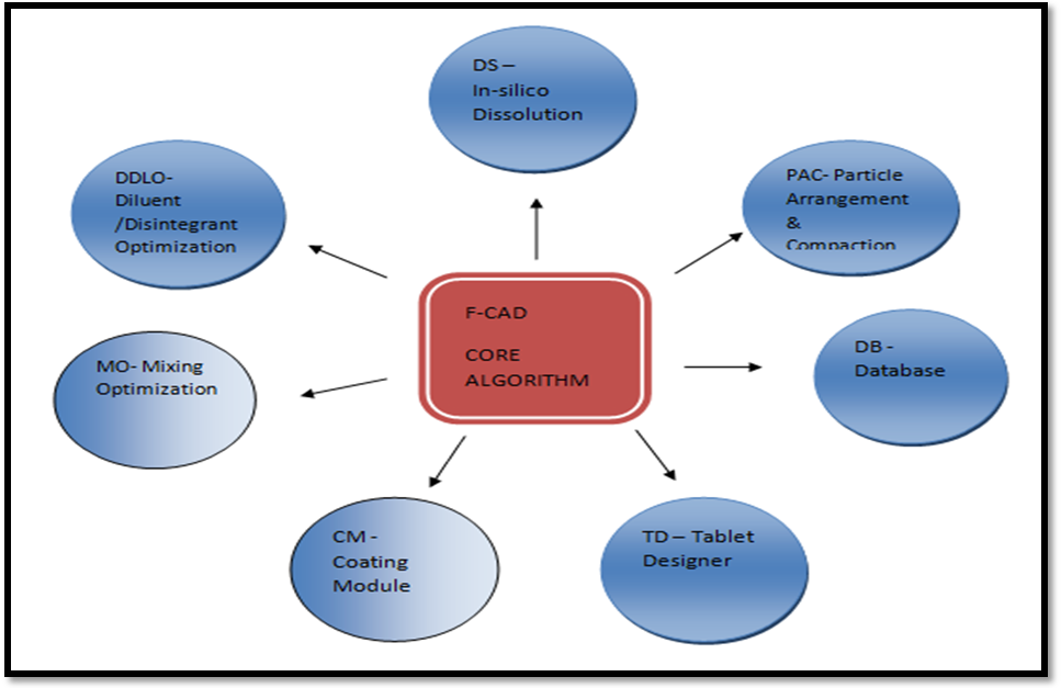 The formulation-computer aided design (F-CAD) is designed by the software modules which is based on the concept of cellular automata to calculate dissolution profiles of the drug substance as a function of the composition and of the physicochemical properties of the components in a formulation (solubility, swellability, effect of the particle size distribution of the drug substance and the excipients, etc.) [30, 31].