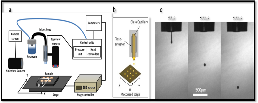 Fig. 5: Schematics of a) Microfab inkjet printer and b) dispenser, c) micro-drop generation [38]