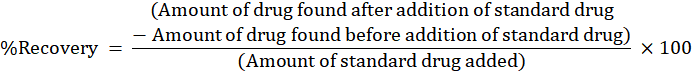 % Recovery = (Amount of drug found after addition of standard drug–Amount of drug found before addition of standard drug)/(Amount of standard drug added) x 100