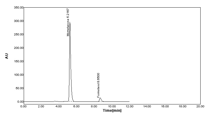 Management of asthma is improved by combining inhaled corticosteroids with long-acting β2-agonists. Inhalation permits effective delivery of the drugs in high concentration to target sites within the lung, minimizing systemic exposure [1]. Combinational therapy of mometasone furoate (MOM) and formoterol fumarate (FOR) has been used in the treatment of COPD and asthma as it produces the additive effects for improving the symptoms, lung functions and reduces exacerbation in patient [2]. MOM (fig. 1) is a white crystalline powder, soluble in acetone, dichloromethane and slightly soluble in ethanol and a highly potent synthetic chlorinated glucocorticosteriod [3]. FOR (fig. 2) is a white crystalline, soluble in ethanol and methanol, slightly soluble in water, practically insoluble in acetonitrile. It appears to be more effective than shorter acting β2 agoinst in the treatment of nocturnal and exercise induced asthma. Moreover, it acts locally in the lung as a bronchodilator [4].