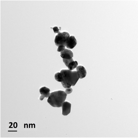 The size and morphology of CuO NPs have been examined using TEM. The nanoparticles are spherical in shape as shown in fig. 2. The TEM micrograph has shown particles of different size approximately from 10 nm to 45 nm. The TEM result also coincides with the estimated particle size in XRD analysis.