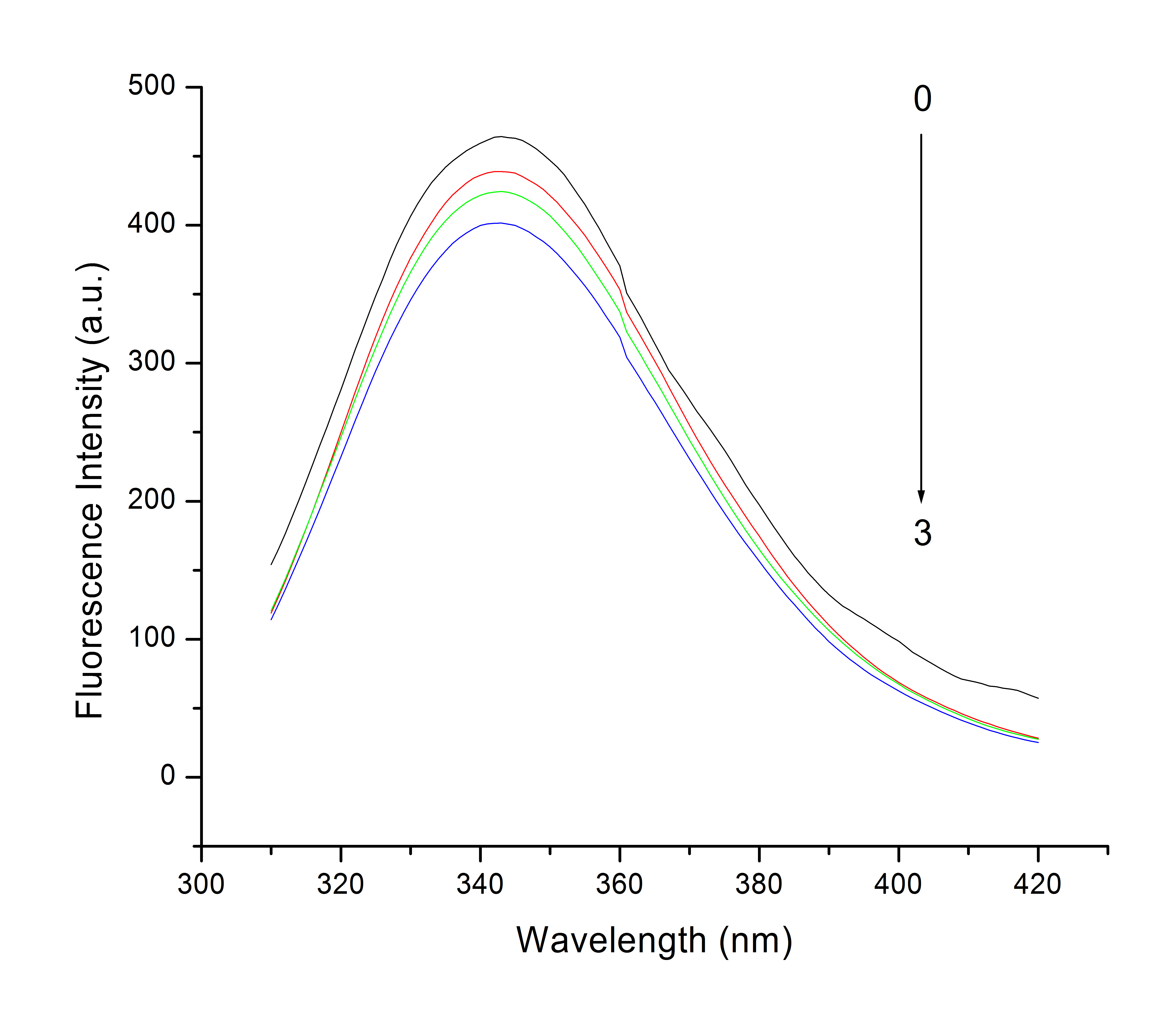 Fig. 3: Fluorescence spectra of BSA at different concentrations of CuO NPs (0, 6, 9 and 12 x 10-8 M)