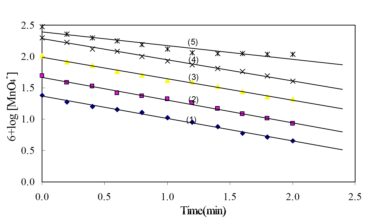 The active species of Mn(VII) in aqueous acid medium can be deduced from the dependence of the rate on the H+ concentration in the reaction medium. The apparent order is less than unity in H2SO4 concentration might be an indication of Mn(VII)species as permanganic acid. In acid medium, permanganic acid (HMnO4) is a more efficient oxidant species of manganese (VII) than permanganate ion [16, 17]. In addition, it was observed that the reaction rate increased with increasing H2SO4 concentration. The effect of ionic strength on the rate of reaction also confirms that HMnO4 is the active species of MnO4-. Thus, in acid medium, MnO4- exists as HMnO4.