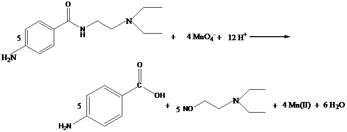 Results: The reaction stoichiometry was determined and the results indicate that five moles of procainamide require four moles of Mn(VII). The oxidation products were identified as Mn(II), p-aminobenzoic acid and N,N-diethyl-2-nitrasoethanamine. The reaction shows first-order kinetics with respect to MnO4-and fractional order with respect to procainamide. Increase in sulphuric acid concentration increased the rate of reaction with fractional order dependence on H+ion concentration. The effect of added products, ionic strength, and dielectric constant of the medium were studied on the rate of reaction.