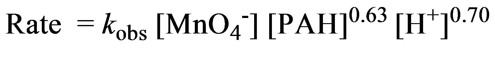 The effect of acid concentration on the reaction rate was studied in the range 0.50 × 10-4 mol dm-3 to 5.0 × 10-4 mol dm-3 at constant concentrations of PAH, MnO4- and at constant ionic strength of 3.0 × 10-3 mol dm-3 at 298K. The rate constant increased with the increase in the acid concentration (Table 1). The order with respect to acid concentration was found to be less than unity (0.70). The experimental rate law is