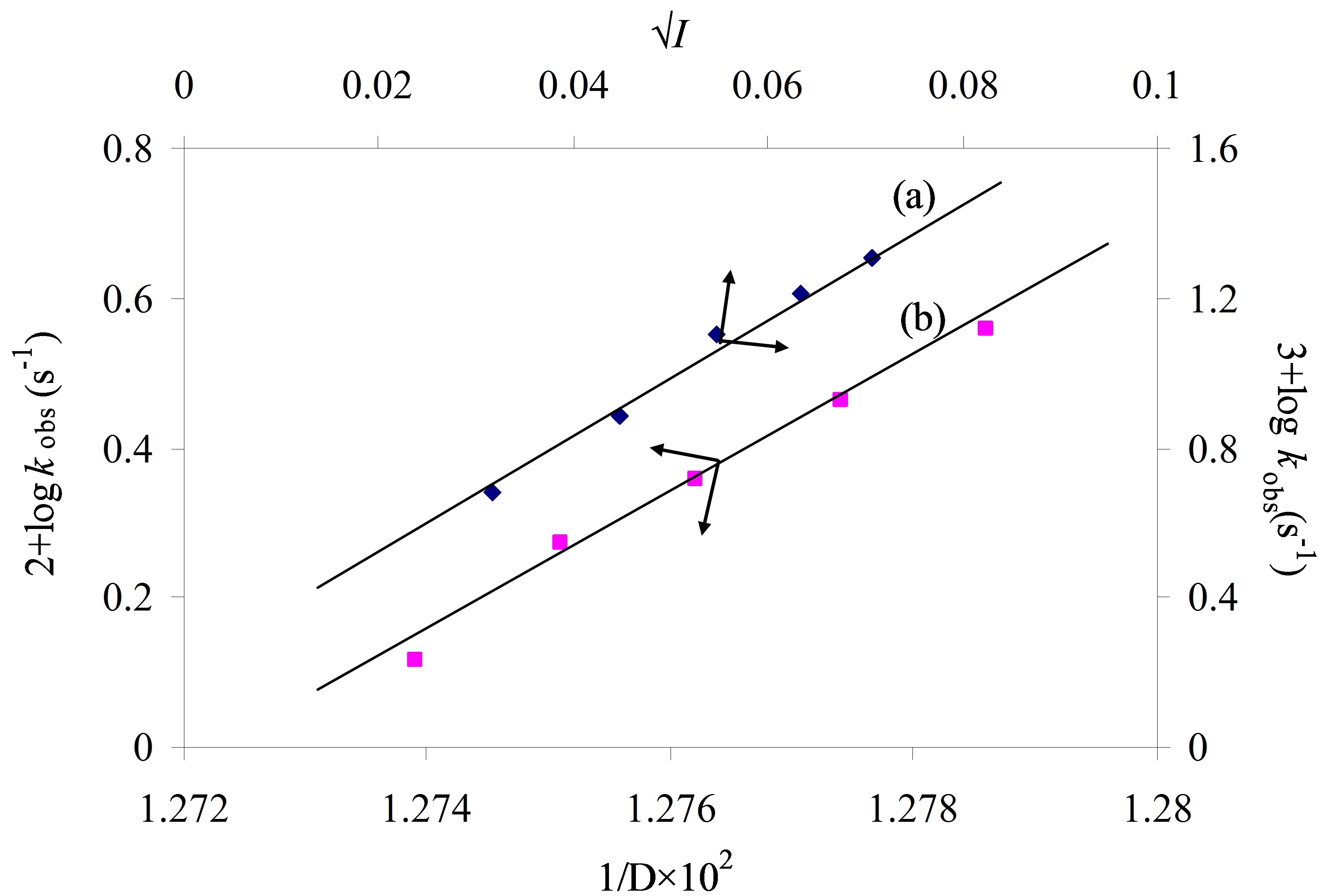 The effect of ionic strength was studied by varying the sodium sulphate concentration from 1.0×10-3 mol dm-3 to 5.0×10-3 mol dm-3 at constant concentrations of Mn(VII), PAH and H+. It was found that, as the ionic strength increases, the rate of reaction also increases. The plot of logkobs versus √I is linear (Fig.5). The dielectric constant of the medium was varied by varying acetic acid - water (v/v) content in the reaction mixture from 0 to 35% with all other conditions being maintained constant. As the acetic acid concentration increased in the reaction medium, the rate of reaction also increases. The plot of log kobs versus 1/D is linear (Fig.5).