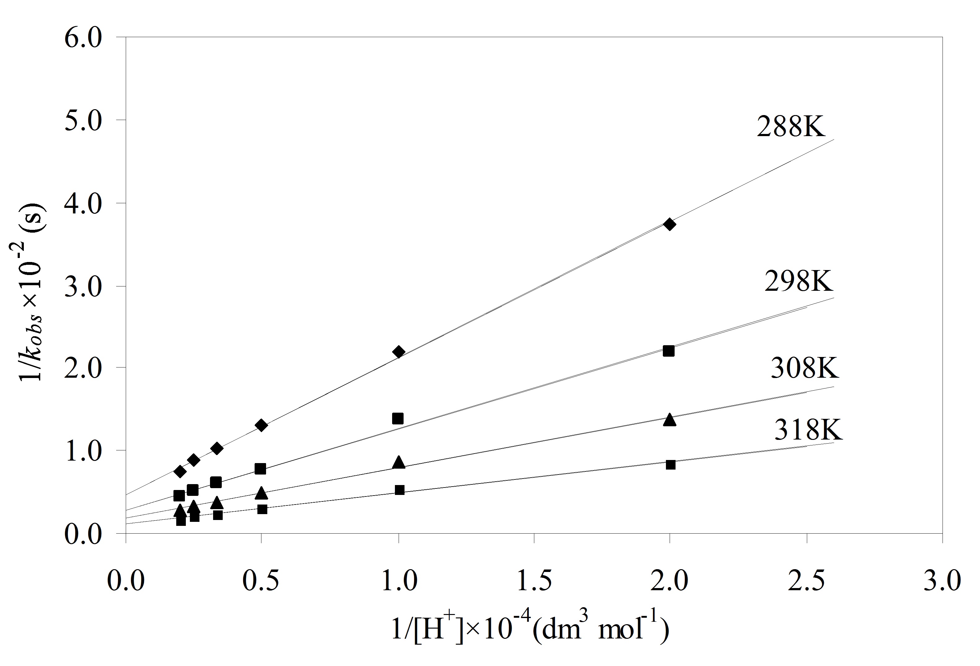 The rate of reaction was measured at four different temperatures 288, 298, 308 and 318K under varying acid and PAH concentrations. The rate was found to increase with increasing temperature. The rate constants of the slow step of the Scheme 1 were obtained from the intercepts and slopes of the plots of 1/kobs versus 1/[PAH] and 1/kobs versus 1/[H+] at the four different temperature (Fig. 7). The energy of activation, Ea was evaluated from the slope of the plot of logk versus 1/T. The enthalpy of activation, ΔH≠, the entropy of activation, ∆S≠and the free energy of activation, ∆G#, were obtained by the Eyring equation [15] and the values are given in (Table 2).