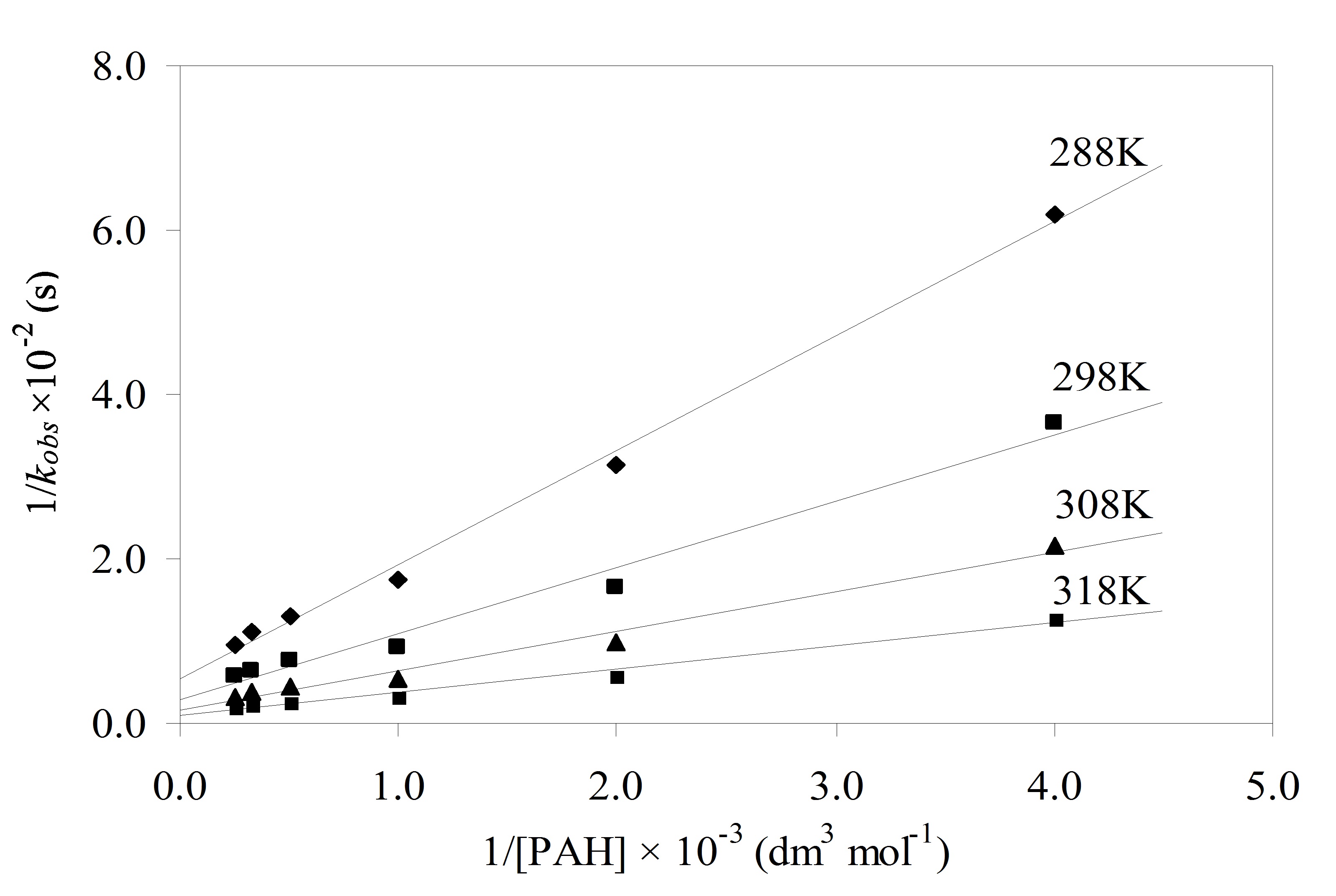 The PAH concentration was varied in the concentration range of 0.25 × 10-3 mol dm-3 to 4.0 × 10-3 mol dm-3 at 298K, keeping all other conditions constant. The rate constant, kobs increased with increase in the concentration of PAH (Table 1). From the slope of the plot of log kobs versus log [PAH], the order with respect to PAH concentration was found to be less than unity (0.63).