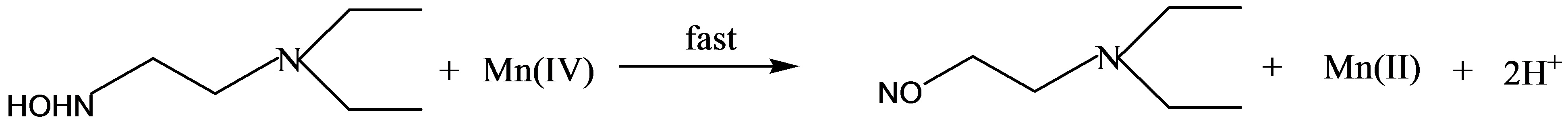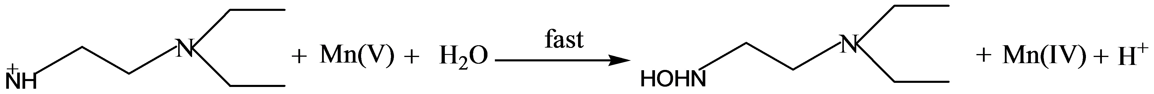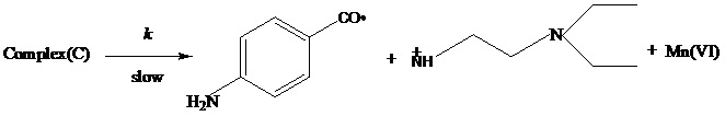 In view of these aspects and the experimental observations, a reasonable reaction mechanism can be proposed in which all of the observed orders with respect to the concentrations of constituents, namely, MnO4-, PAH and H+ can be well accommodated. The results suggest that the protonated form of Mn(VII), HMnO4 is the active species of MnO4- in prior equilibrium, which reacts with one mol of PAH in the second equilibrium step to form a complex, then that decomposes in a slow step to give p-aminobenzaldehyde free radical and diethylethane- 1, 2- diamine ion and Mn(VI). The free radical, p-aminobenzaldehyde undergoes hydrolysis in presence of Mn(VI) in a fast step to give final product, p-aminobenzoic acid and Mn(V), while diethylethane 1, 2- diamine ion undergoes hydrolysis in presence of Mn(V) in further fast step to form a product, 2-(diethylamino)-N-hydroxyethanamine and Mn(IV). In further fast step 2-(diethylamino)-N-hydroxyethanamine reacts with Mn(IV) to give a product, N,N-diethyl-2-nitrosoethanamine and Mn(II). The formed Mn (VI) and Mn (V) are unstable in acid medium [16] and could not be detected. All results may be interpreted in the form of Scheme1.