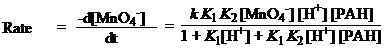 MnO4-, is a powerful oxidizing agent in acid medium. The stable oxidation product of MnO4- in acid medium is Mn(II) and Mn(IV). The reaction between PAH and MnO4- has a stoichiometry 5:4 with a first-order dependence on the MnO4- concentration and less-than-unit order in both the PAH and H2SO4 concentrations. The fact that, Mn(II) is the reduced product of Mn(VII) in the present reaction might indicate that [PAH] shows a strong reducing character in H2SO4 medium.