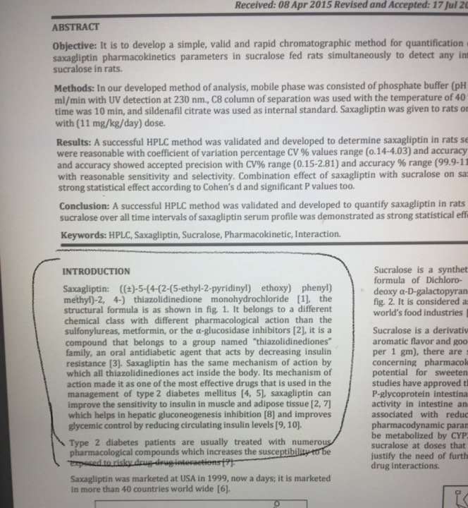 Results: A successful HPLC method was validated and developed to determine saxagliptin in rats serum, overall intra-day precision and accuracy were reasonable with coefficient of variation percentage CV % values range (o.14-4.03) and accuracy % range (99.5-104), while inter-day precision and accuracy showed accepted precision with CV% range (0.15-2.81) and accuracy % range (99.9-116). The coefficient of correlation was 0.99949 with reasonable sensitivity and selectivity. Combination effect of saxagliptin with sucralose on saxagliptin serum profile was demonstrated as strong statistical effect according to Cohen’s d and significant P values too.