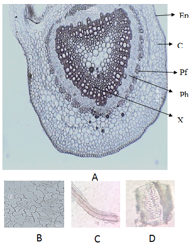 Fig. 1: Microscopy and powder study of leaf, A. T. S of Leaf (10x), B. Anomocytic stomata (40x), C. Lignified fibers (10x), D. Xylem vessels (10 x), Ep: Epidermis, Co: Collenchyma, Pf: Pericyclic fibers, Ph: Phloem, Xy: Xylem