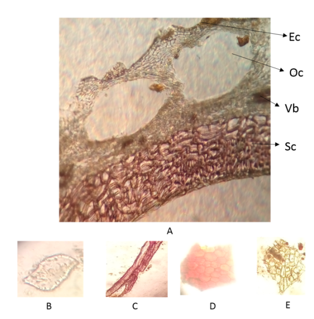 Fig. 2: Microscopy and powder study of fruit, A. T. S of pericarp (10x), B. Stone cells (10x), C. Lignified fibers (10x), D. Brown testa (10 x), E. Endosperm (10x), Ec: Epicarp, Oc: Oil cells, Vb: Vascular bundles, Sc-Stone cells