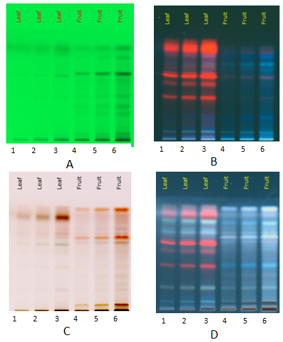 Fig. 3: Fingerprinting of extracts, (Track 1, 2, 3-1µl, 2µl, 5 µl of leaf extract; track 4,5,6-1µl, 2µl, 5 µl of fruit extract) A. UV 254 nm before derivatisation, B. UV 366 nm before derivatisation; C: 540 nm after derivatisation; D: UV 366 nm after derivatisation