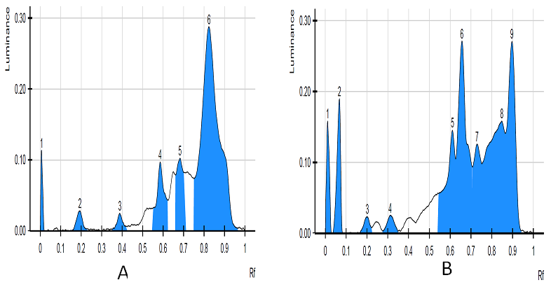 Fig. 4: HPTLC chromatogram of extracts after derivatisation at 540 nm. A. Leaf B. fruit